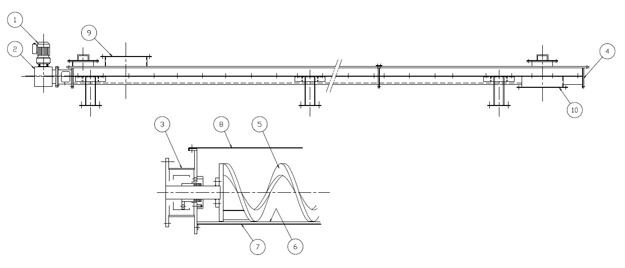 無軸スクリューコンベヤは駆動部、ケーシング(トラフ)、スクリューから構成される非常にシンプルな構造です。